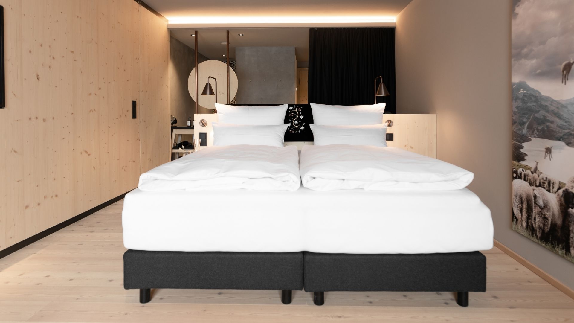 Wer etwas mehr Platz braucht und gern im warmen, quirligen Wasser planscht, bucht am besten AMRAIs Schafgemach Junior Suite – natürlich mit Bergblick. Die 35 m² große Suite bietet als Highlight einen privaten Außen-Whirlpool. Darüber hinaus ist diese Suite ausgestattet mit einem flauschigen Doppelbett, einem Bad mit Regendusche, einer optionalen Sauna/Dampfdusche und einer großzügigen Terrasse mit Garten für den spontanen Auslauf, sollte dem Schaf der Sinn nach Bocksprüngen stehen.