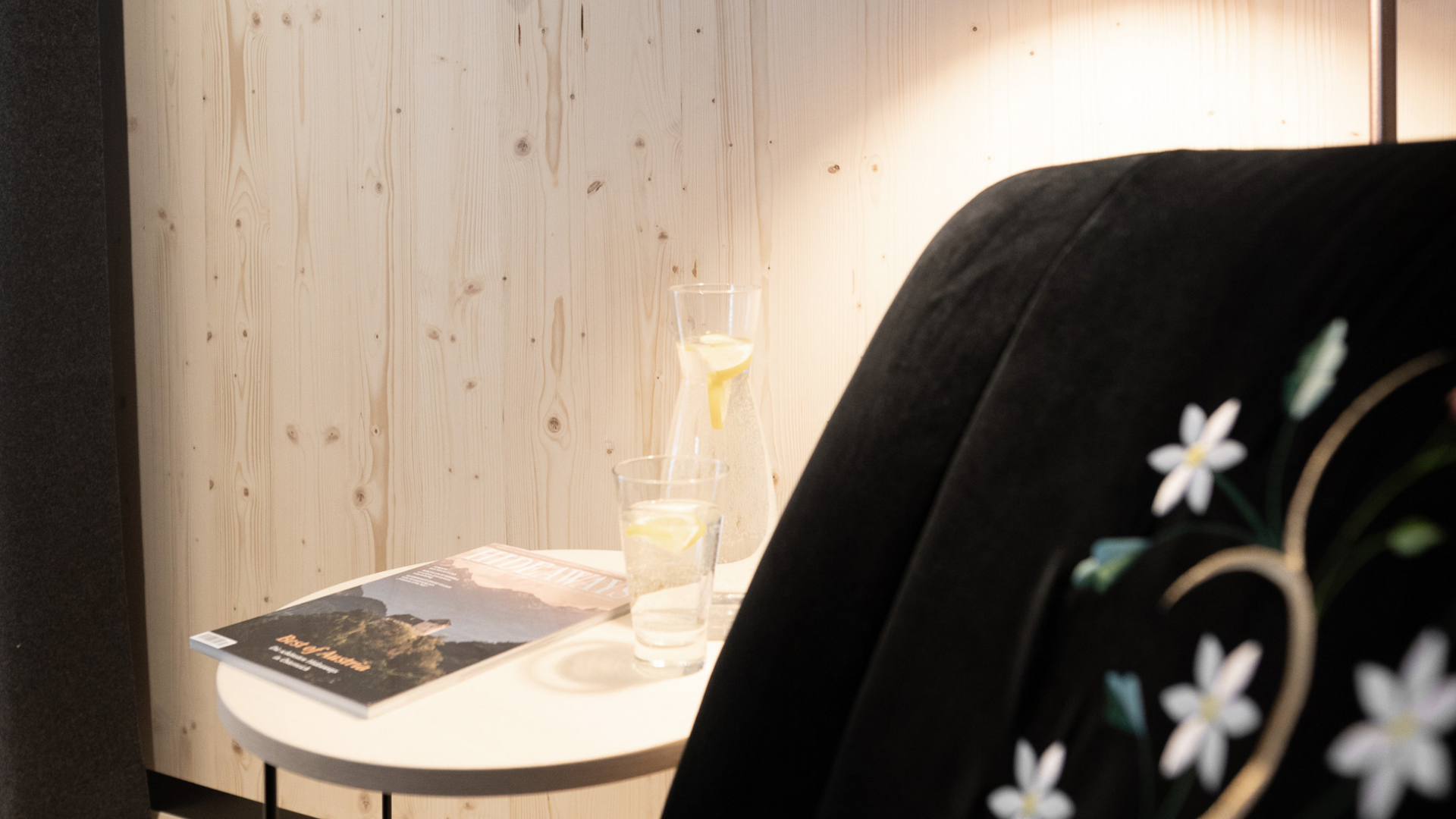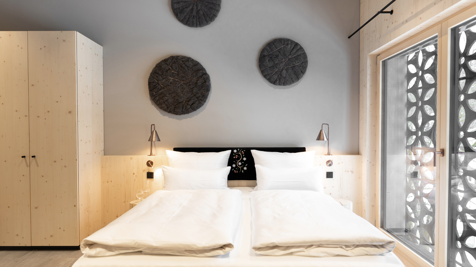 Ob Du’s glaubst oder nicht, bei AMRAI gibt es ein Schafgemach, das nennt sie das Schwarze Schaf. Warum? Weil jede Herde ein schwarzes Schaf hat und das AMRAIsche eben genau in diesem Zimmer abhängt. Das Schwarze Schaf liebt es naturgemäß etwas dunkler, daher ist dieses Schafgemach nicht ganz so sonnendurchflutet wie die anderen Schafgemache. Wenn du es minimalistisch magst, dann vermisst du weder Balkon, Minibar oder Schreibtisch, noch brauchst du eine Kaffeemaschine oder einen Wasserkocher. Das Doppelbett ist flauschig, von ihm aus blickst du auf die Bergkulisse. Dieses Zimmer ist wie geschaffen für eine erholsame Spritztour in die Berge. Wenn du abends müde in die Kissen sinkst, zwinkert dir von Zeit zu Zeit AMRAIs schwarzes Schaf aus der Wand freundlich zu.